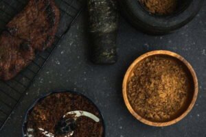 6. Llévala al mortero y dale golpes con la piedra del mortero o molcajete. Tienes que lograr una apariencia como la que ves en la fotografía.