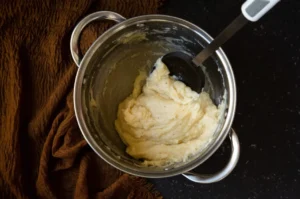 - Cuando la masa esté tibia, agregar los huevos e incorporar hasta conseguir una consistencia más suave. (Es importante que la masa no esté muy caliente para que el huevo no se cocine)