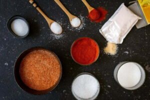 - Reservar tres cucharadas de azúcar y utilizar el resto para mezclar junto con la páprika, chile, grenetina, limón en polvo y sal.