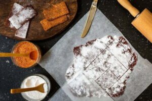 - Espolvorear la última cucharada de azúcar y cortar rectángulos de aproximadamente 10 cm de largo.