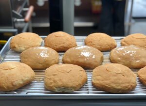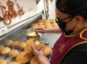 Por último elaboran un glaseado para cubrirlos elaborado a base de azúcar, pepita de calabaza y clara de huevo, para el cual utilizan un caso de cobre y una pala de madera; este es un proceso muy artesanal. Después de un par de horas los molletes están listos para disfrutar.