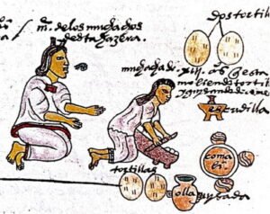 Según cuenta Fray Bernardino de Sahagún (s. XVI) las que hacían tortillas, eran mujeres de gran oficio y cocinaban: tortillas untadas de chile o salsas, las apretadas con las manos, rellenas de carne de rana, aves o las untadas con miel, así también los tamales elaborados de distintas mazorcas eran simples o rellenos de frijoles y bebían atoles endulzados.