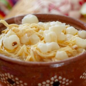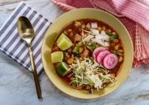 El pozole rojo es una deliciosa y tradicional sopa mexicana que combina sabores intensos y texturas reconfortantes.