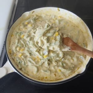 3. Incorporar las rajas y el elote escurrido. Sofríe unos diez minutos más. Sazonar con sal y pimienta.