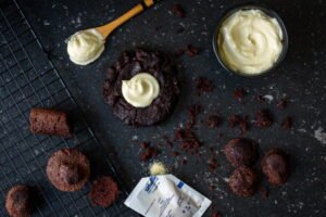 •  Derretir la mantequilla y el chocolate en una olla a baño maría, revolver de manera constante y cuidando que no se queme. También se puede derretir en el microondas en intervalos de cinco segundos.