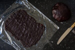 2. Poner cada bolita de masa en un papel film y extender con la mano o rodillo, formar rectángulos de  12 por 15 centímetros, aproximadamente.