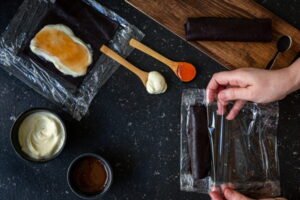 4. Rellenar cada uno de los rectángulos con la crema y mermelada, después enrollar para formar los ocho choco roles.