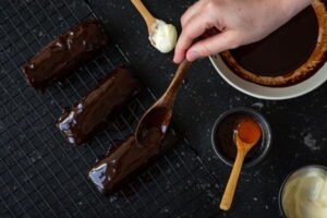 6. Retirar del congelador y cubrir con el chocolate derretido.