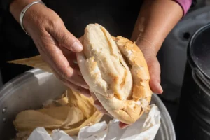 4. Colocar el tamal caliente sobre una de las mitades del bolillo.