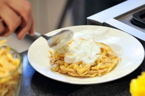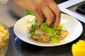 NOTA: Se puede servir como buffet al colocar el pollo desmenuzado y los complementos en platos por separado para que cada quien se sirva lo que quiera. Si utiliza aguacate, poner un poco de limón inmediatamente después de cortar para que no se ponga oscuro.