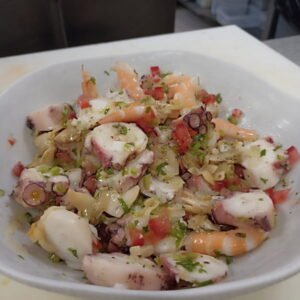 2. Picar el pulpo, los camarones y la almeja e incorporar a la verdura.